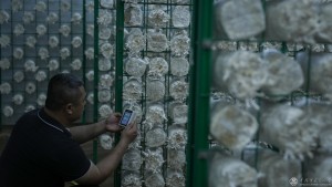 2023年2月13日,技术员监测出菇室环境状态。智能化出菇房包含多种环境探头和调控设备,为蘑菇生长提供适宜环境。环境调控是工厂化栽培区别于传统栽培的关键。