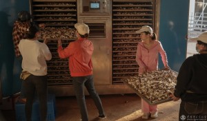 2023年2月13日,工人们将采摘的蘑菇进行烘干处理。剩下的蘑菇包也不浪费,可用于蚯蚓养殖、蘑菇栽培再利用和有机肥制备等。