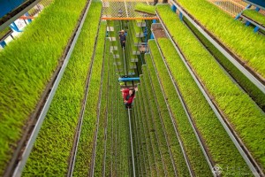 科技育苗 张随良(河南) 2023 年 4 月 8 日,河南信阳光山县,青龙河合作社的农民在全自动智能化工厂育秧基地进行再生水稻育秧苗的工作。