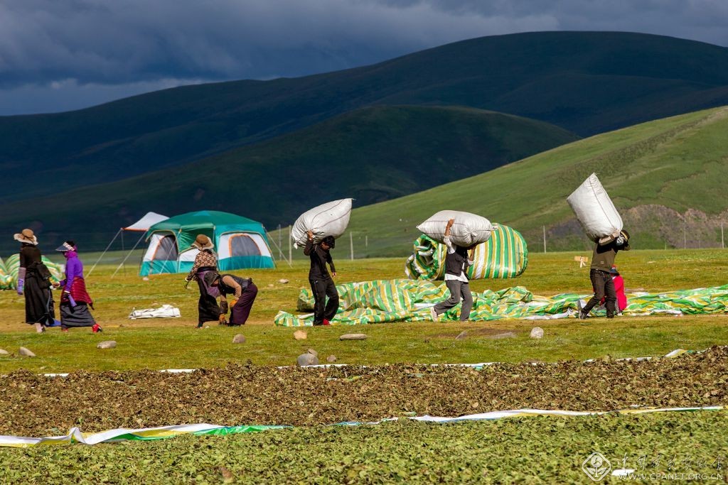 生晒藏药“独一味”(组照) 周玉燕(广东) 2021 年 8 月 4 日,四川甘孜州,藏族同胞在草原上晒制藏药“独一味”。“独一味”是藏、蒙、纳西等民族的民间草药,具有止血、镇痛、抗菌消炎、增强免疫力等作用。