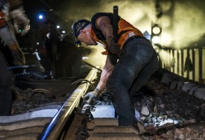 2018年4月18日,京包(北京—包头)线夜间更换铁道轨枕作业。