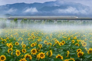 2020年8月18日,一高铁动车组行驶在内蒙古卓资县向日葵田园间。