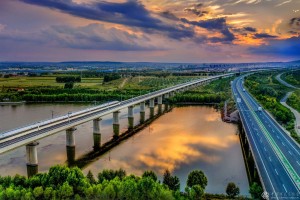 2021年9月3日,一高铁动车行驶在内蒙古美丽的集宁区霸王河大桥上。