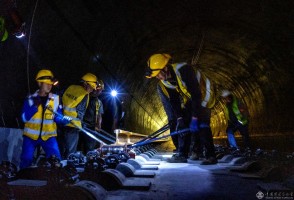 2024年5月21日,集(宁)大(同)原(平)高铁铺轨进入内蒙古乌兰察布市丰镇段首个隧道。工人们正在精准使轨道入槽。