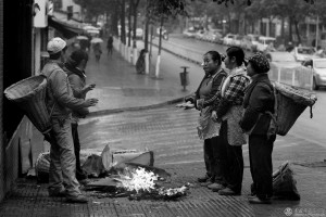 2013年1月9日,贵阳市云岩区友谊路,打工者烤火取暖等候活计。