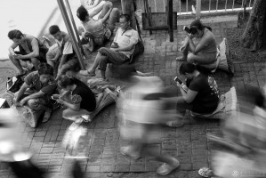 2018年 9月3日,贵阳市南明区文昌路,打工者通过手机了解外面世界。