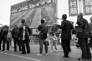 2024年5月15日,黔东南州榕江县县城,一群男子通过大屏幕观看村超现场直播。