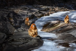 在寒冷漫长的冬季,天气寒冷、资源有限,金丝猴为冬季觅食仅靠取食树芽和树皮为生,山里的湖水已经结冰,只好下到低海拔寻找食物。