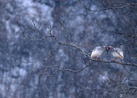 陕西各地迎来冬日初雪,秦岭下着雪画面十分美好,一对朱鹮站在风雪中互相交流、理羽。