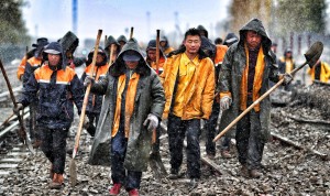 2018年11月1日,铁路工人们在甘泉堡站冒着雨雪线路施工完毕,拿着工具转场下一个施工地点。.