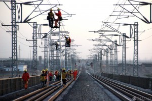 2014年5月9日接触网工人们在新建吐库二线架设接触网线路。