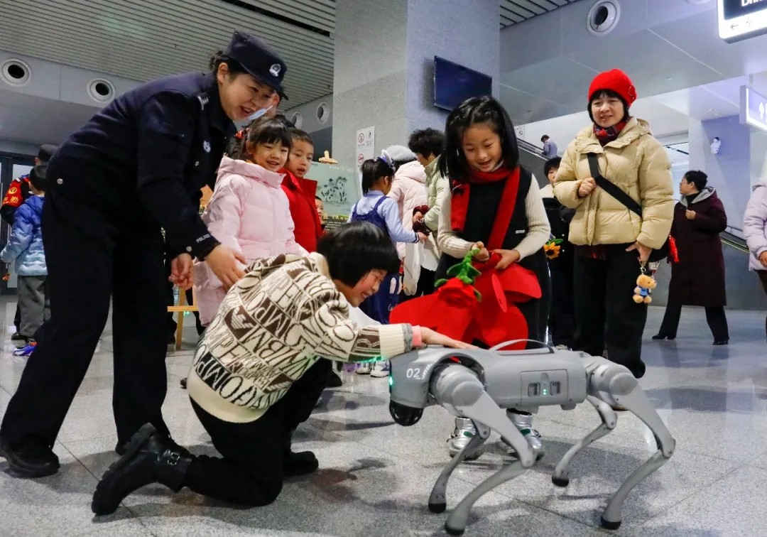 2月2日上午,桂林站,小旅客与机器狗在候车室开心互动,近距离感受科技护航春运安全。郑长贤 摄