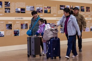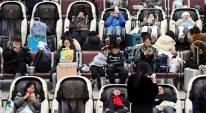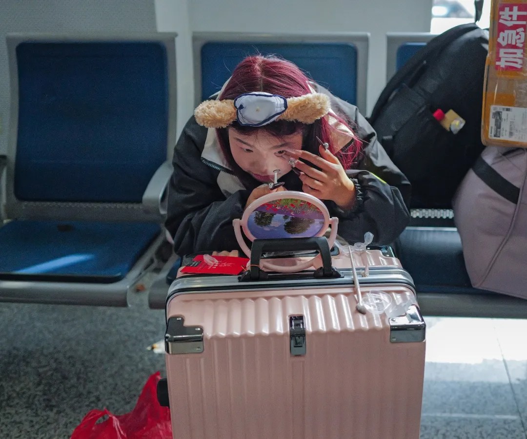 2月2日,金华站,回贵阳的旅客正在贴睫毛。谭秋民 摄