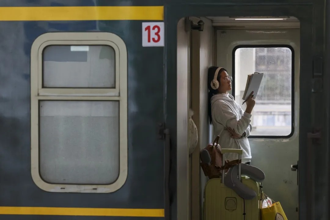2月2日,深圳站,在深圳开往洛阳的火车上,一名旅客上车后靠窗阅读。朱洪波 摄
