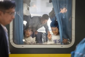 2月2日,深圳站,在开往洛阳的火车上,小朋友面对车窗外的镜头挥手打招呼。朱洪波 摄