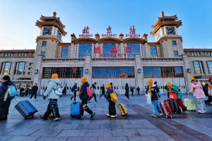 2月2日,北京站,站前广场一队小朋友在领队的带领下准备返乡回家。曹博远 摄