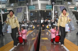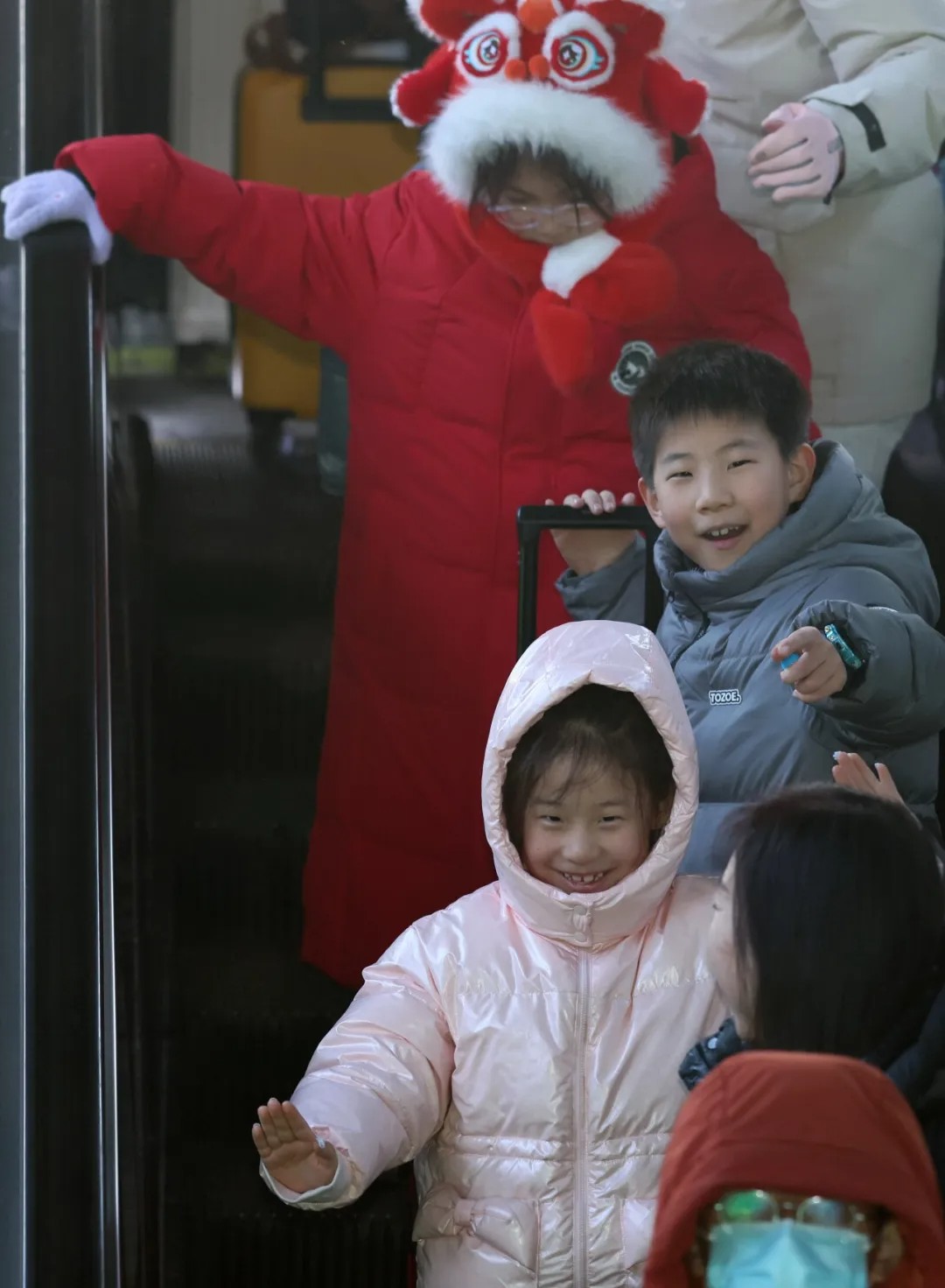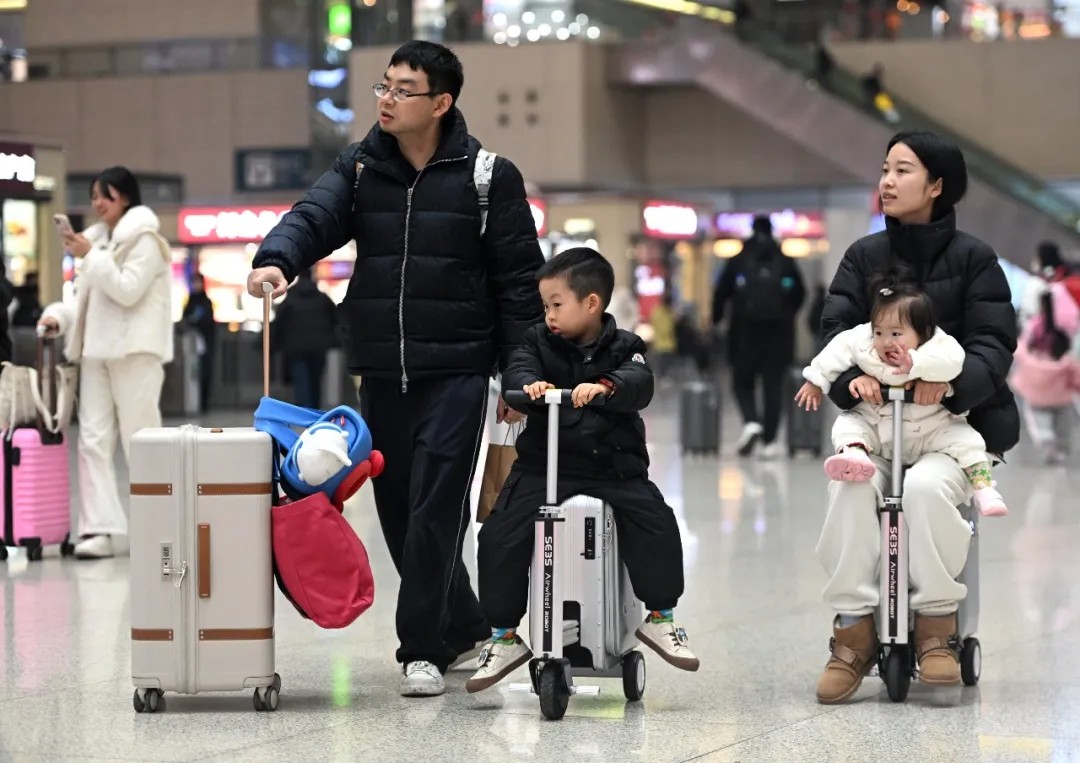 2月2日,郑州东站,家长带着小朋友骑着带轮行李箱前往进站口。周甬 摄
