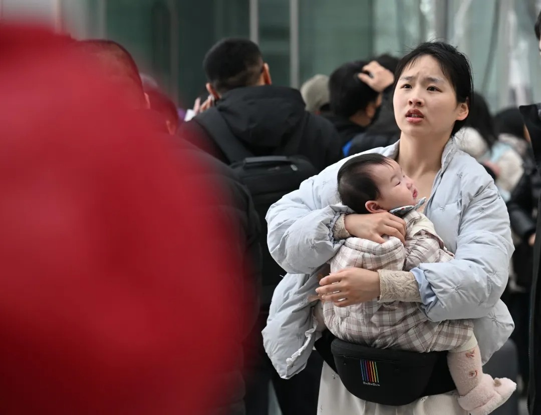 2月2日,合肥南站,候车大厅内一位怀抱孩子的旅客正在查看车辆信息。王从启 摄