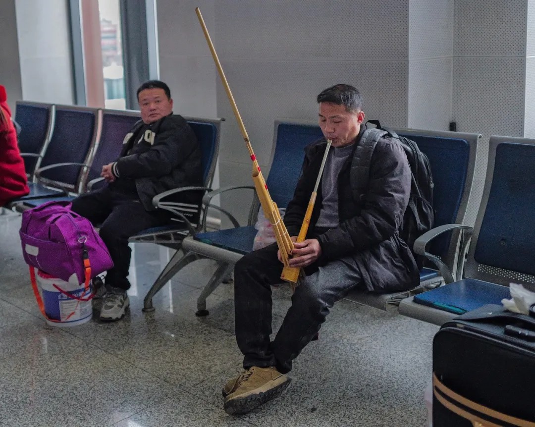 2月2日,金华站,回云南昭通老家过年的苗族旅客正在吹奏本民族的乐器。谭秋民 摄