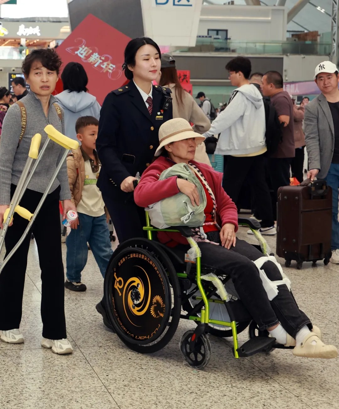 2月5日,深圳北站工作人员为特殊人群提供热情周到的服务。深圳铁路部门采取了多项便民利民的措施,努力实现旅客平安,有序,温馨。赵青 摄