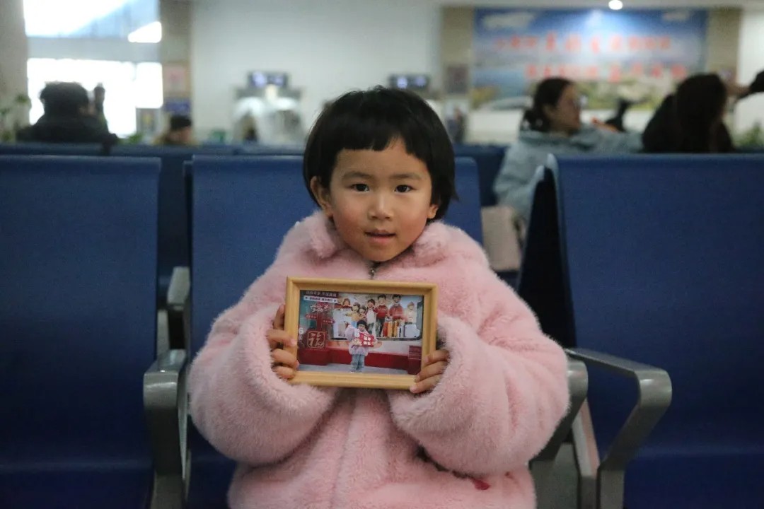 2月2日,安徽阜阳火车站候车大厅内,一名跟随母亲返乡的小女孩向摄影师展示志愿者为她拍的照片。当天,阜阳颍东青年志愿者协会、阜阳北站团委联合开展了“情暖旅途 定格最美瞬间”公益拍照活动。韩振 摄