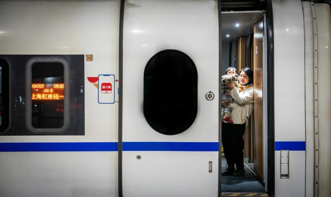 2月2日,铁路上海站2026年春运首趟临客列车G4021次临时旅客列车从上海虹桥站始发开往贵阳北站,载着204名旅客踏上春运返乡路。孟雨涵 摄
