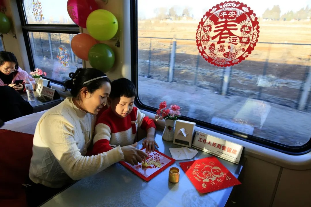 2月2日,大连至满洲里“滨疆号”春运列车上,母女正在感受拓印福字体验。刘慎库 摄