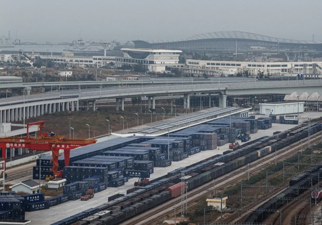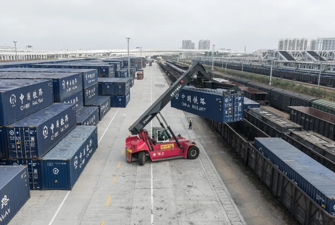 海南自由贸易港海口南港“二线口岸”铁路货列查验区,叉车正忙碌地从列车上装卸货物。