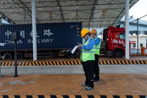 海南自由贸易港海口南港“二线口岸”铁路货列查验区,一派忙碌景象。