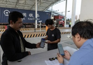 将海关监管货物运抵海口南港“二线口岸”铁路货列查验区后,货车司机打开二维码给工作人员查验。