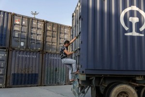 完成开箱抽查后,一名货车司机关上集装箱门。