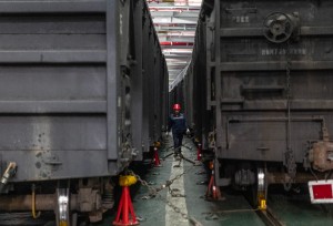 工作人员对轮渡内拆解后的火车车厢进行固定。