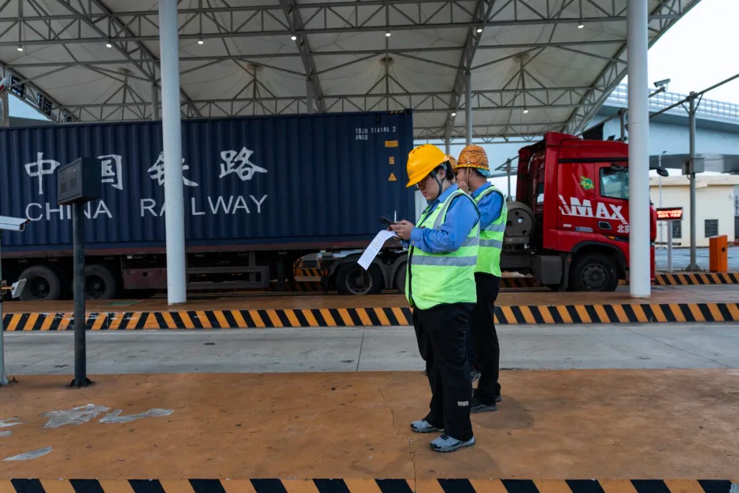 颜惠雯(左一)与同事正在指挥货车进入查验区。