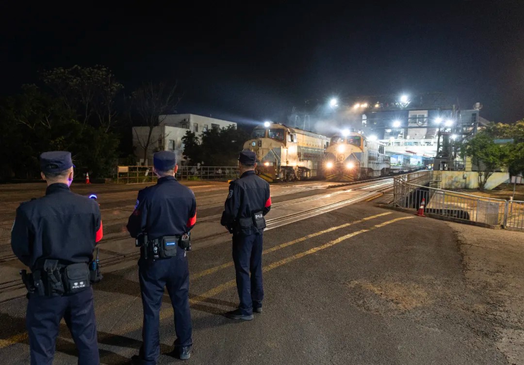 满载海关监管货物的列车缓缓驶上粤海铁路轮渡,民警们在沿线进行执勤。