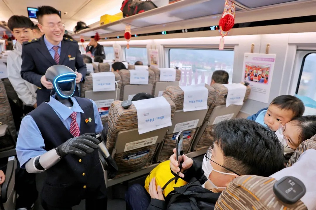 2026年2月1日,杭州客运段“西子号”G41次列车上,机器人“福兴”穿梭车厢,向旅客问好,送上新春祝福。周围 摄