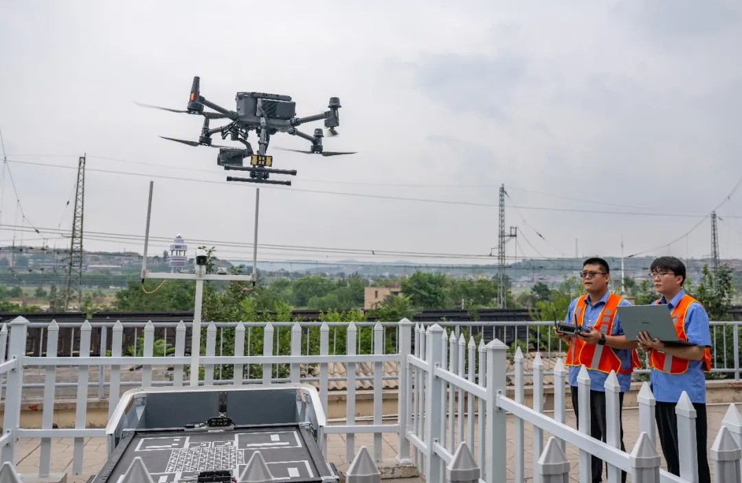 2025年6月19日,河北石家庄,王政策(左)和同事查看铁路巡线无人机蜂巢操作系统。无人机自动巡检蜂巢实现了无人机的批量化、智能化作业,可以快速完成重点地段的巡检,提升了工作效率和数据精准度。赵杰 摄