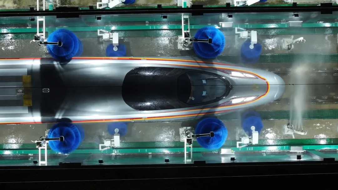 2026年2月2日,湛江北动车运用所的动车组通过洗车机进行清洁。胡靖 摄