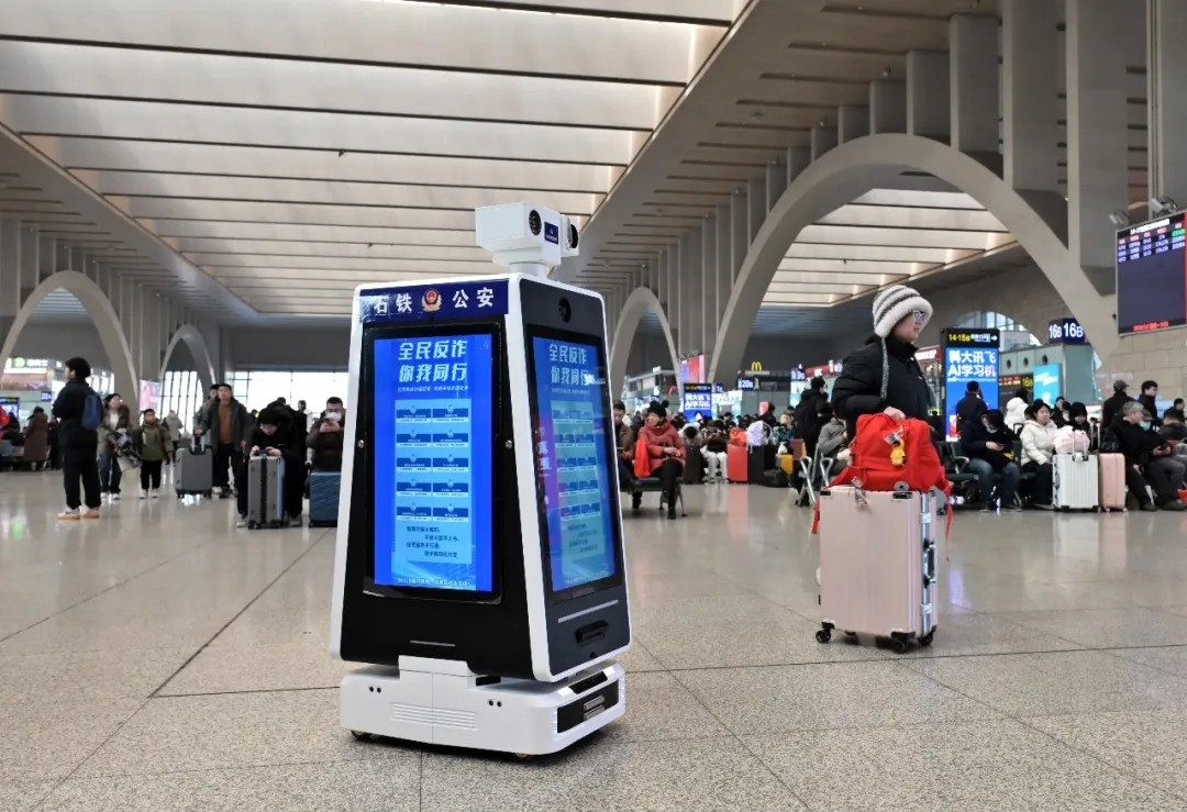 2026年2月2日,河北石家庄站候车大厅,多媒体四屏巡检机器人正在工作。翟羽佳 摄