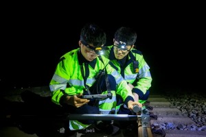 2026年2月3日,广东肇庆南广铁路西江特大桥上,广州南高铁工务段工作人员对钢轨进行廓形测量,保障高铁列车安全平稳运行。夏力文 摄