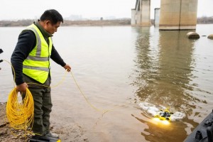 2026年1月29日,在沪昆高铁湘江特大桥下,铁路工人操作水下机器人检测河床情况。陈思汗 摄