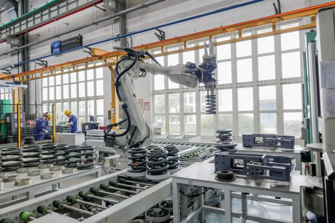 2025年12月18日,上海动车段转向架检修车间,检修机器人正在组装轴箱弹簧。朱顺志 摄
