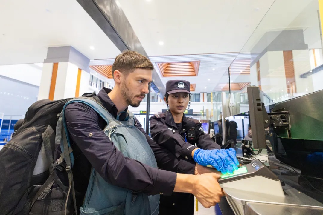 13时38分,云南西双版纳州勐腊县磨憨镇,磨憨铁路口岸的工作人员指导外国旅客运用现代化设备办理通关手续。卫海林 摄