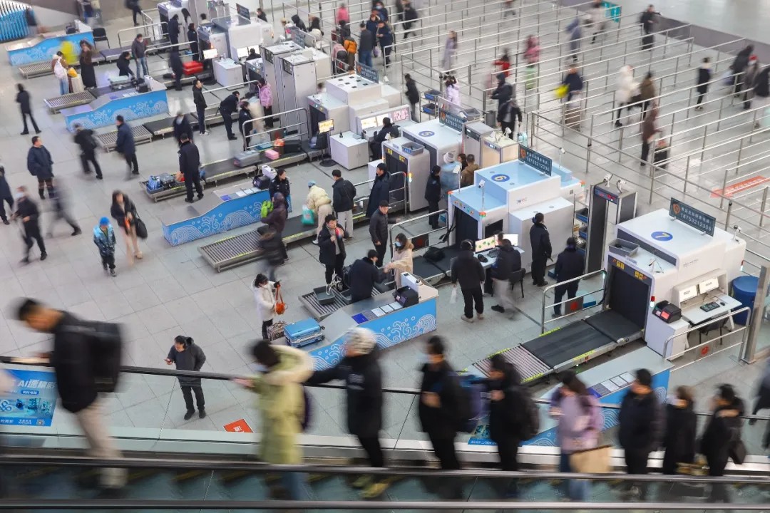 07时50分,山东青岛北站,旅客有序通过安检进入候车厅。张鹰 摄