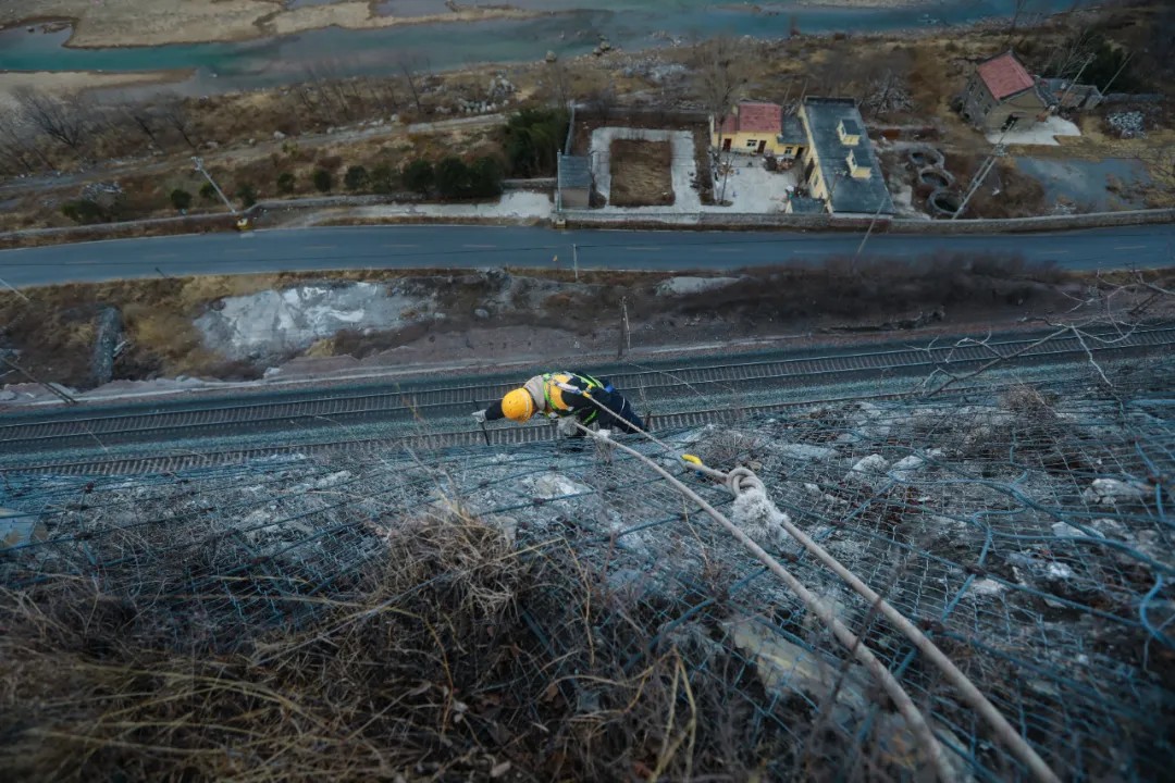 08时02分,河南,国铁郑州局月山工务段月山桥隧车间月山检查工区的工作人员登上百米悬崖峭壁,对山体进行危石作业检查,保障列车运行安全。李洪远 摄