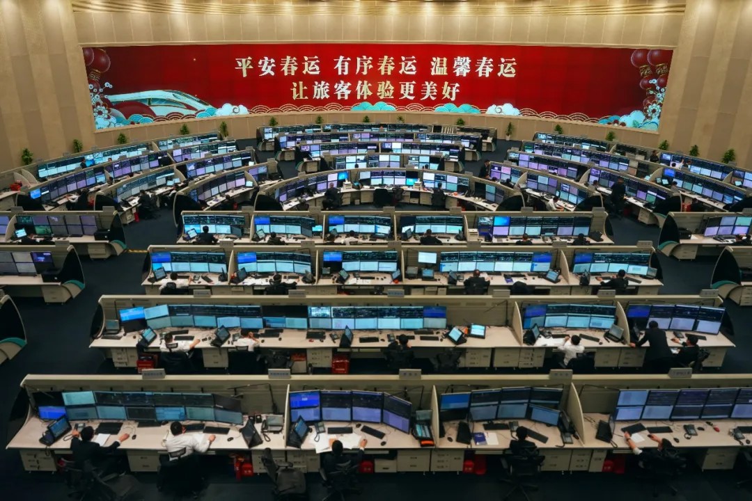 14时01分,国铁上海局调度指挥中心,工作人员正在调度指挥管辖线路上运行的列车。唐红星 摄