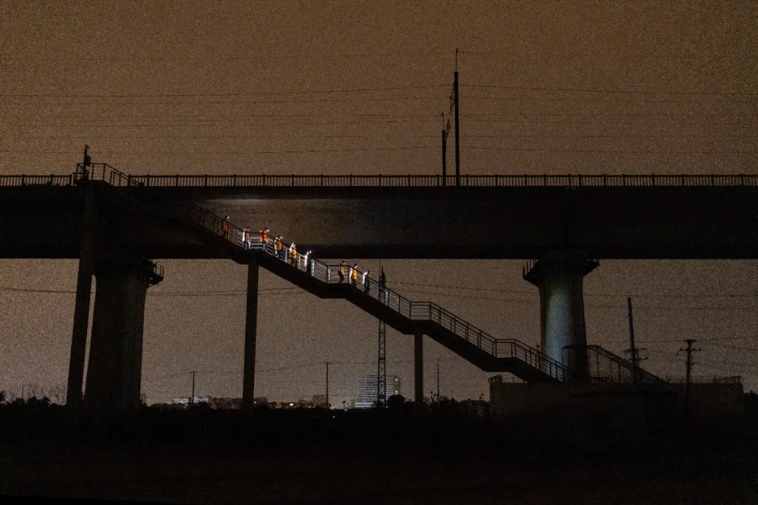23时34分,上海嘉定区沪苏通铁路K109+500m处,工务段“钢轨医生”往返铁路桥与地面之间,进行巡检作业。赖鑫琳 摄