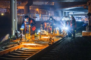 01时21分,北京南站,工人师傅操作打磨机为高铁轨道实施“毫米级”修整。万全 摄