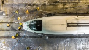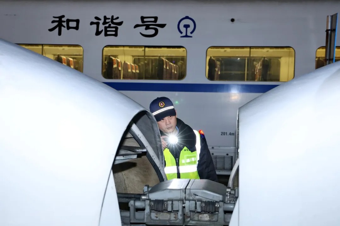 03时39分,江苏,动车组随车机械师在南通动车所进行动车组车上作业检查。许丛军 摄