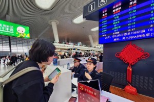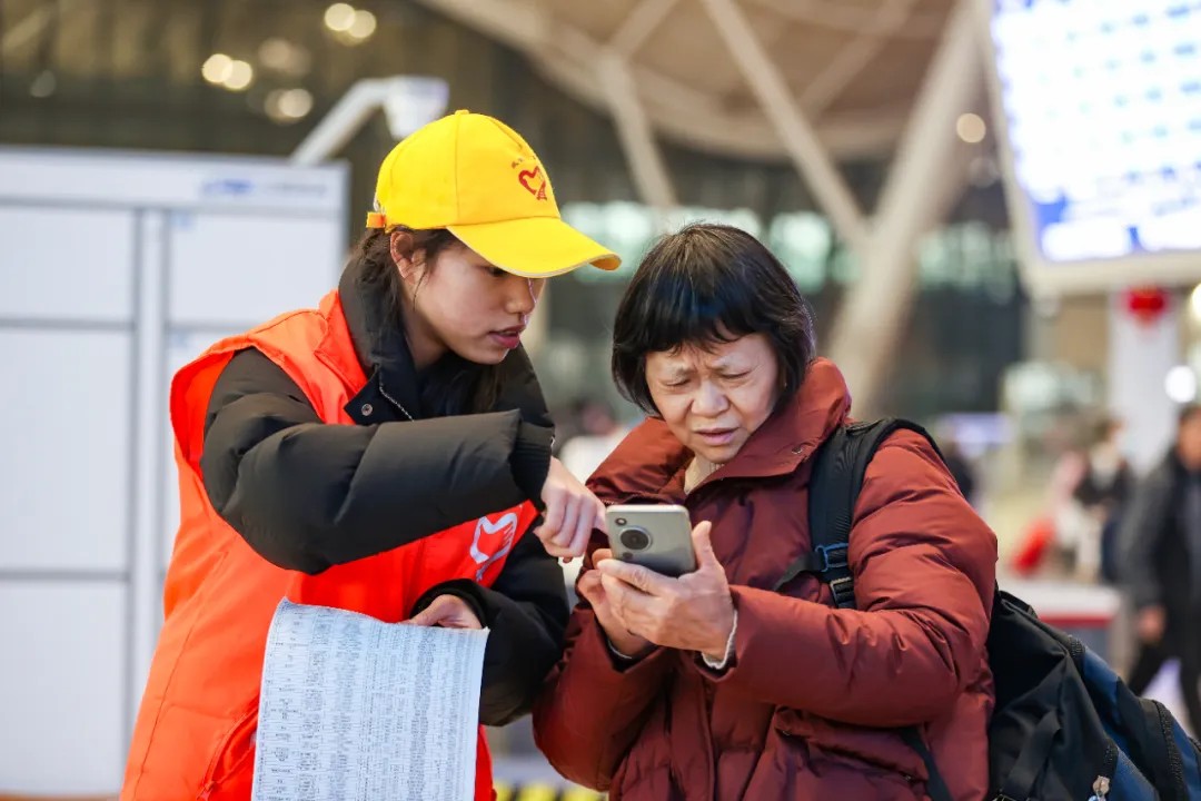 15时01分,杭州东站候车大厅,问讯处工作人员为归乡旅客解释改签流程。徐昌国 摄
