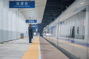 05时57分,北京西站,工作人员在站台引导乘客有序乘车。张武军 摄